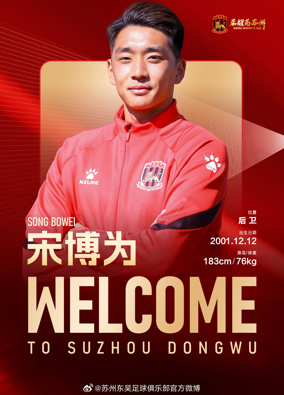 经友好协商并达成一致,球员宋博为正式加盟苏州东吴足球俱乐部,为苏州东吴出战新赛季中甲及足协杯赛事。