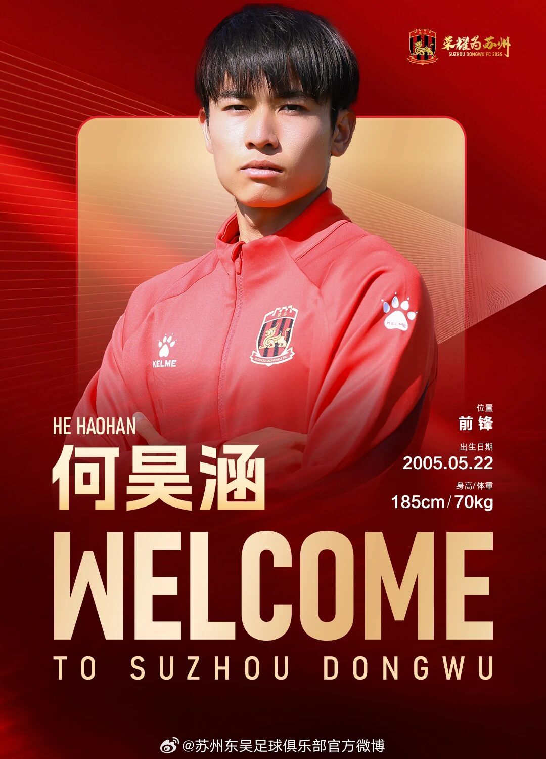 经友好协商并达成一致,球员何昊涵正式加盟苏州东吴足球俱乐部,为苏州东吴出战新赛季中甲及足协杯赛事。