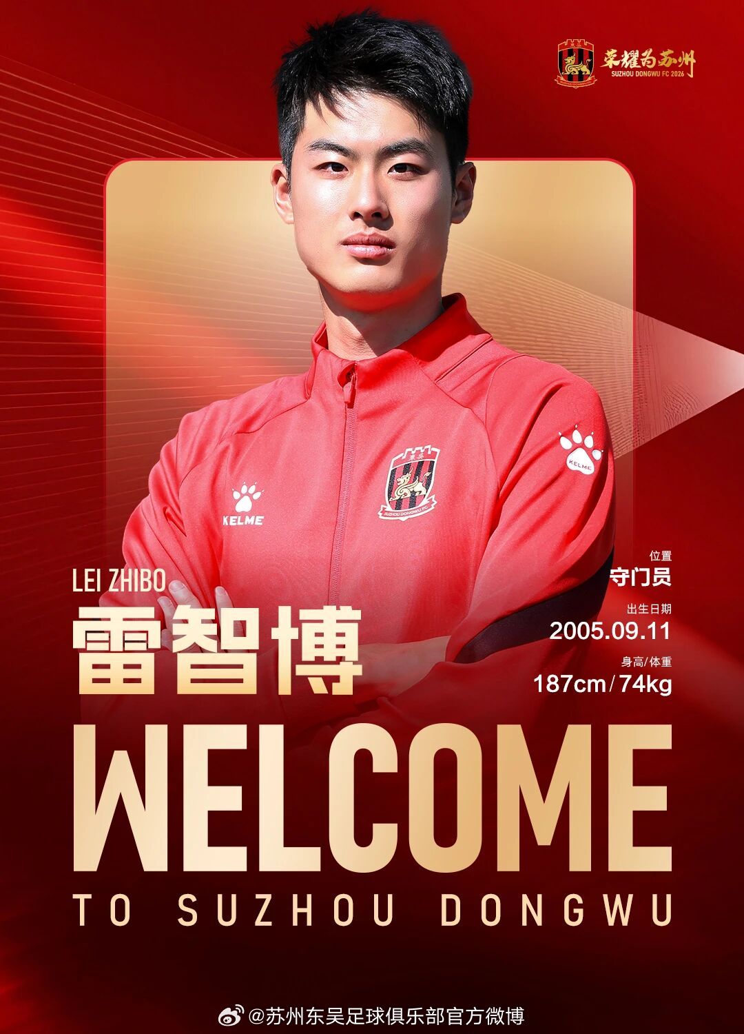 经友好协商并达成一致,球员雷智博正式加盟苏州东吴足球俱乐部,为苏州东吴出战新赛季中甲及足协杯赛事。