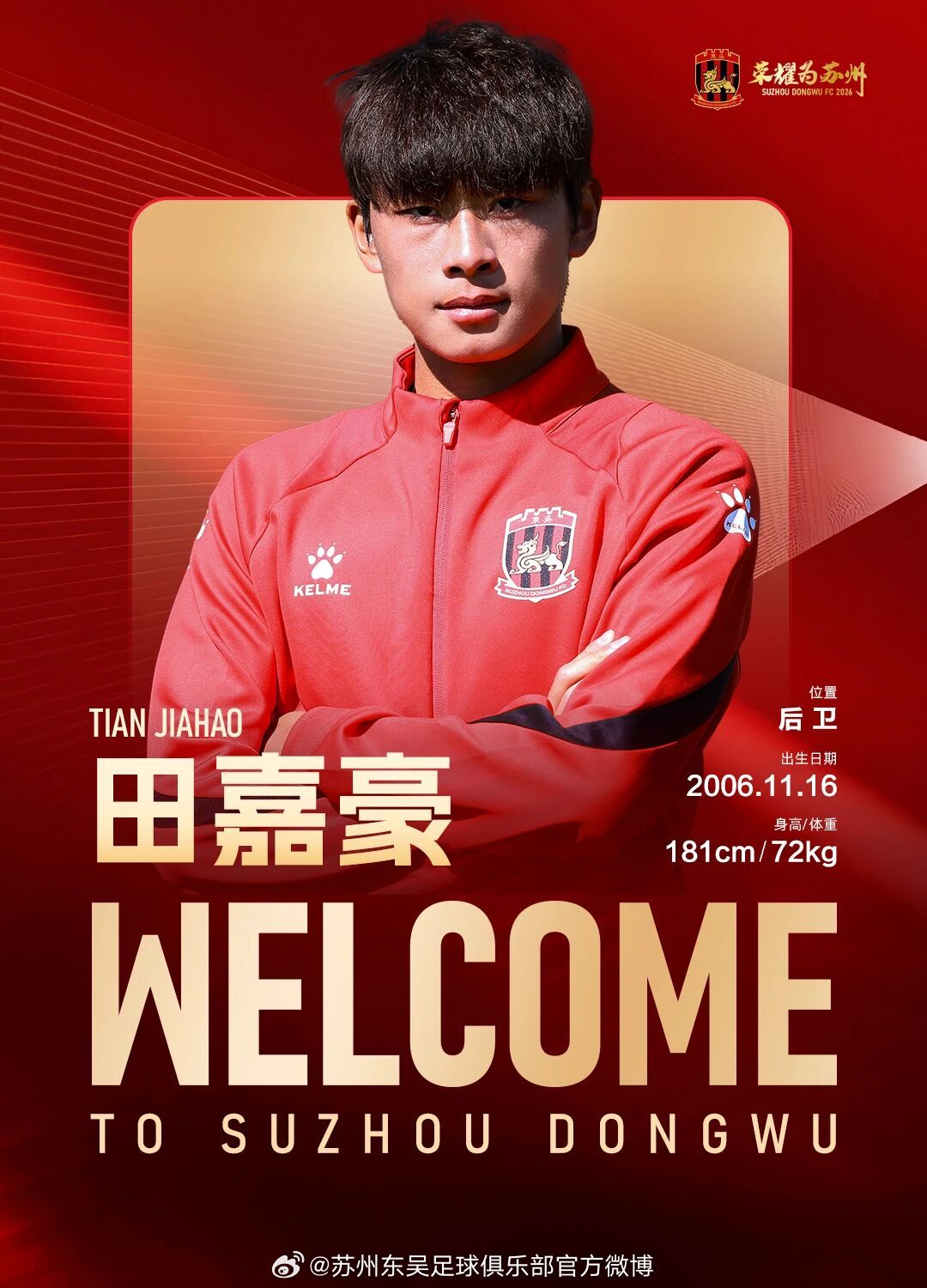 经友好协商并达成一致,球员田嘉豪正式加盟苏州东吴足球俱乐部,为苏州东吴出战新赛季中甲及足协杯赛事。