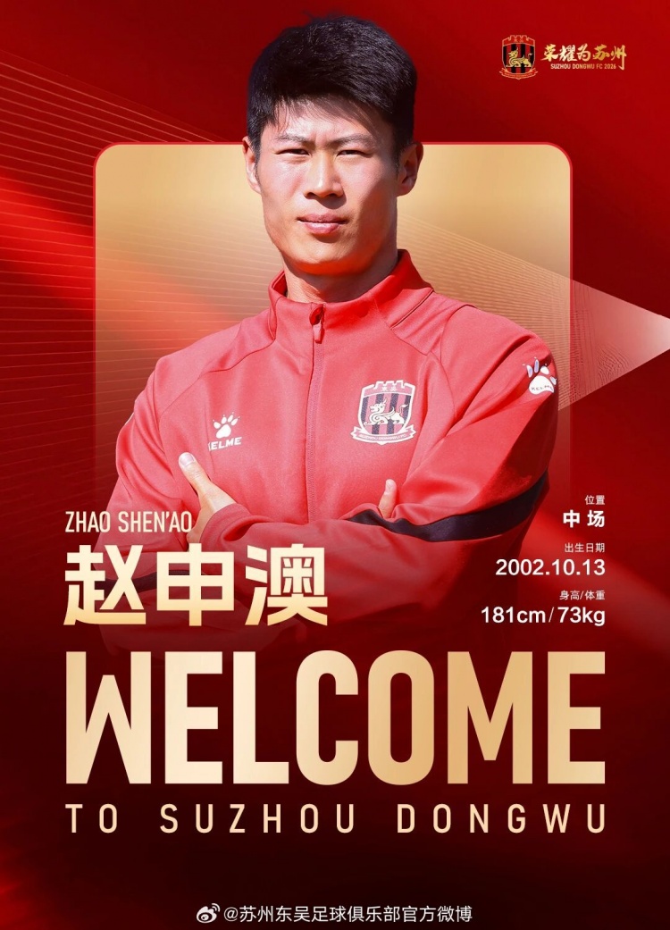 经友好协商并达成一致,球员赵申澳正式加盟苏州东吴足球俱乐部,为苏州东吴出战新赛季中甲及足协杯赛事。