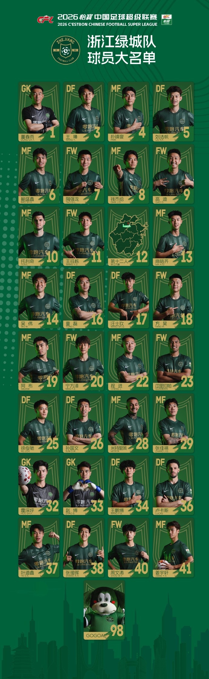 浙江队新赛季名单如下: