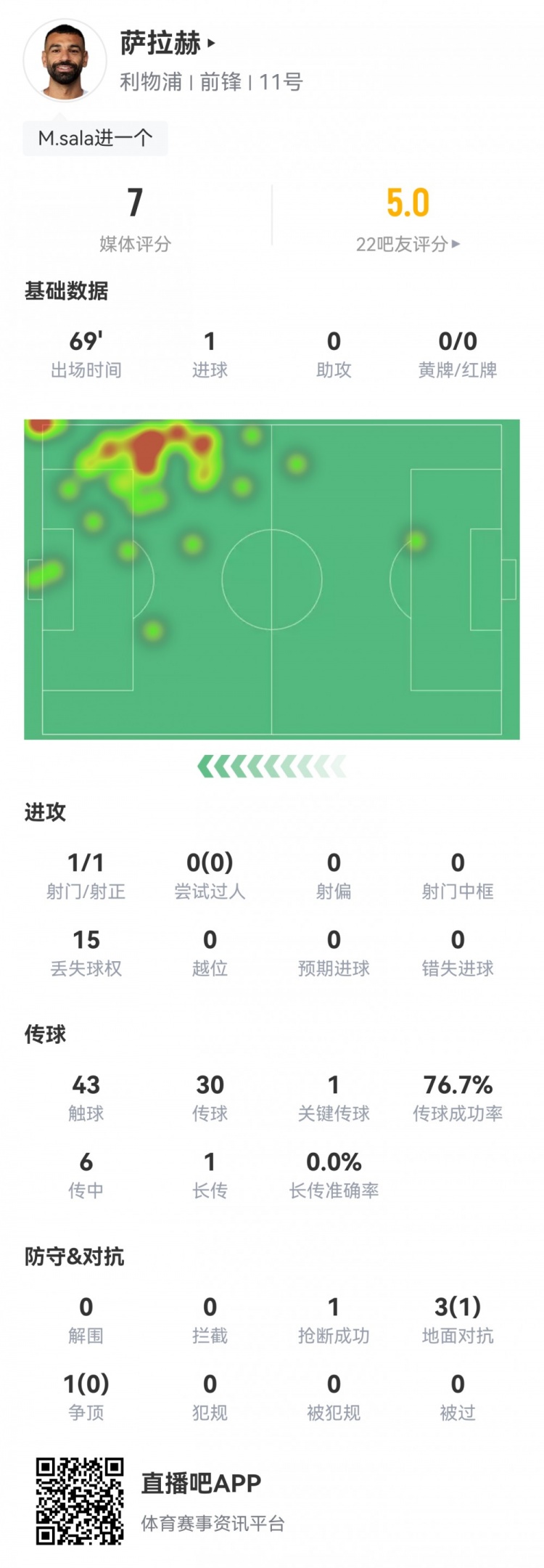 3月7日讯 足总杯1/8决赛,利物浦3-0客场领先狼队。此役萨拉赫首发69分钟被换下,球员全场重点数据如下↓