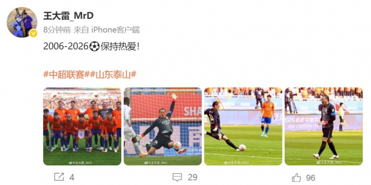 泰山队中超首轮3-0击败辽宁铁人,王大雷首发出战贡献1次扑救,获评7分。赛后,王大雷晒出多张本场比赛的图片,并配文:2006-2026⚽️保持热爱!