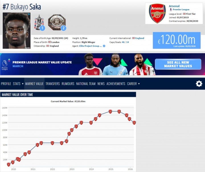 03月09日讯 德转更新英超身价,阿森纳当家球星萨卡身价连续第三次下跌,来到1.2亿欧。