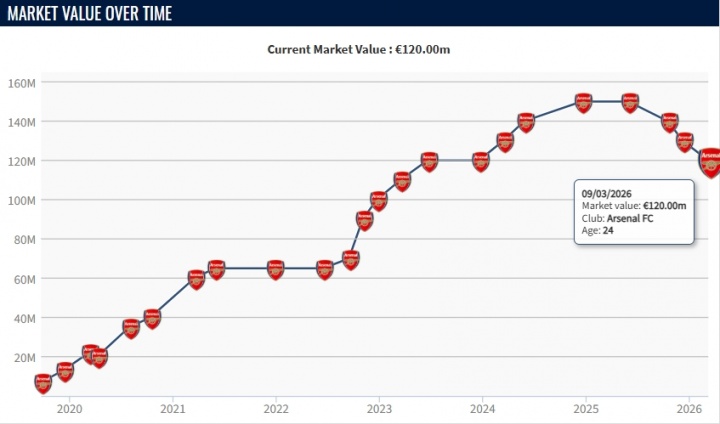 萨卡一年前还是生涯最高的1.5亿欧身价,随后接连下跌到1.4亿、1.3亿,以及最新的1.2亿。