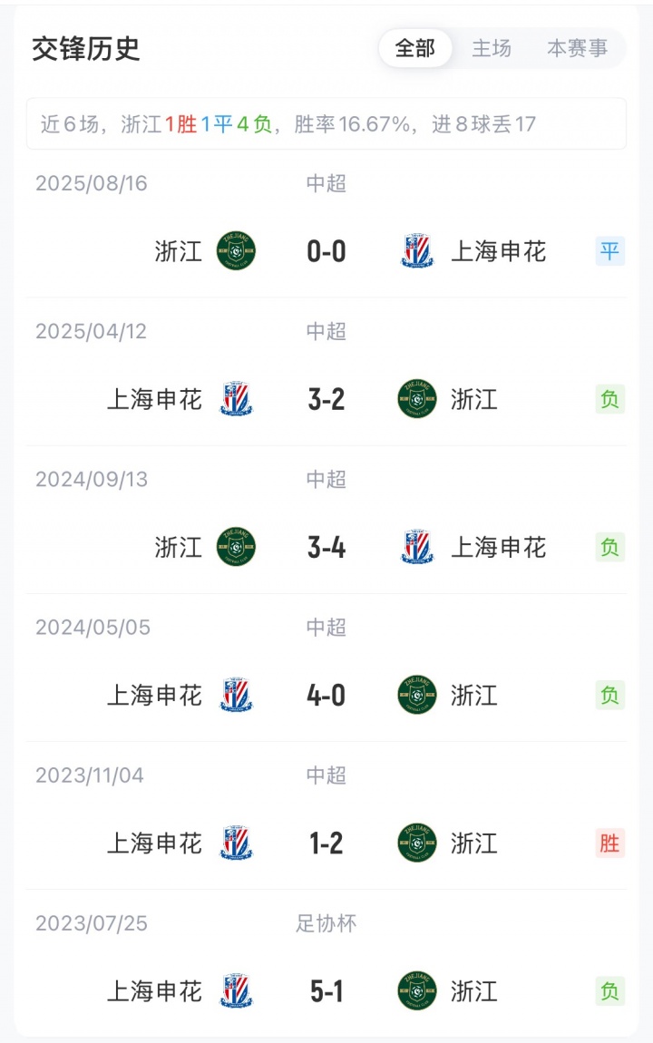浙江vs申花近6场交锋战绩