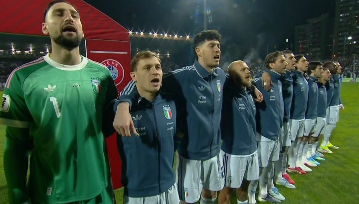 04月01日讯 意大利vs波黑即将开打,赛前,意大利众将士,以及主教练加图索、领队布冯高唱国歌。