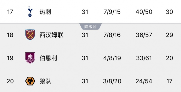 目前的英超积分榜上,热刺仅以1分优势领先降级区的西汉姆联。而由于西汉姆联本轮先赛,一旦铁锤帮取胜,他们就将暂时在排名上反超热刺。