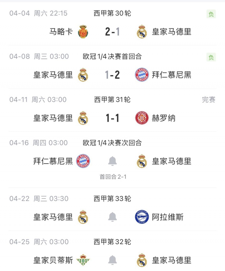 皇马周中欧冠主场1-2不敌拜仁,面临出局危机。他们上一轮联赛遭马略卡绝杀,本轮主场又遭赫罗纳逼平,先赛落后巴萨6分。
