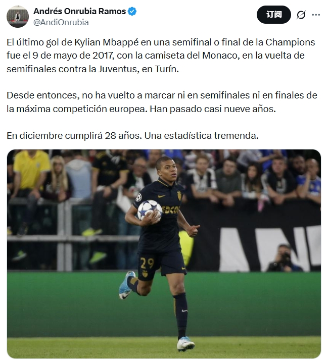 记者Andrés Onrubia Ramos写道:“姆巴佩上一次在欧冠半决赛或决赛中进球,是在2017年5月9日,当时他身披摩纳哥球衣,在都灵对阵尤文图斯的半决赛次回合比赛中破门。