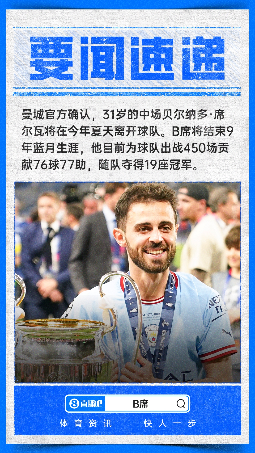 4月16日讯 官方消息,31岁的葡萄牙中场贝尔纳多·席尔瓦将于本赛季结束后离开曼城,结束长达9年的曼城生涯。