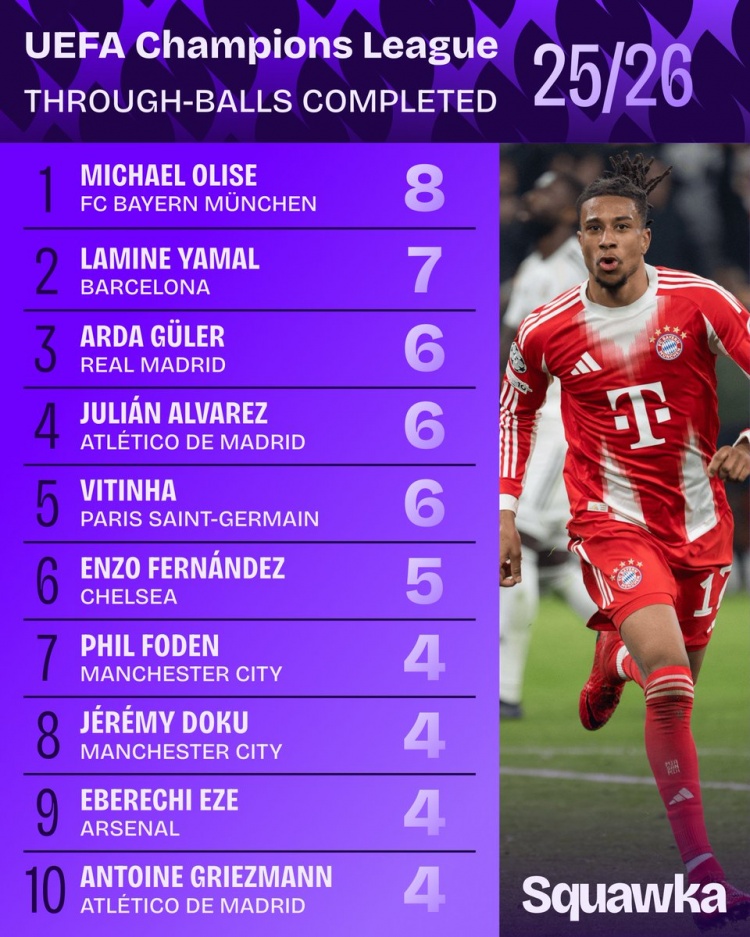 4月16日讯 Squawka列出了本赛季欧冠成功直塞传球排名,奥利塞8次居首,亚马尔7次第二。