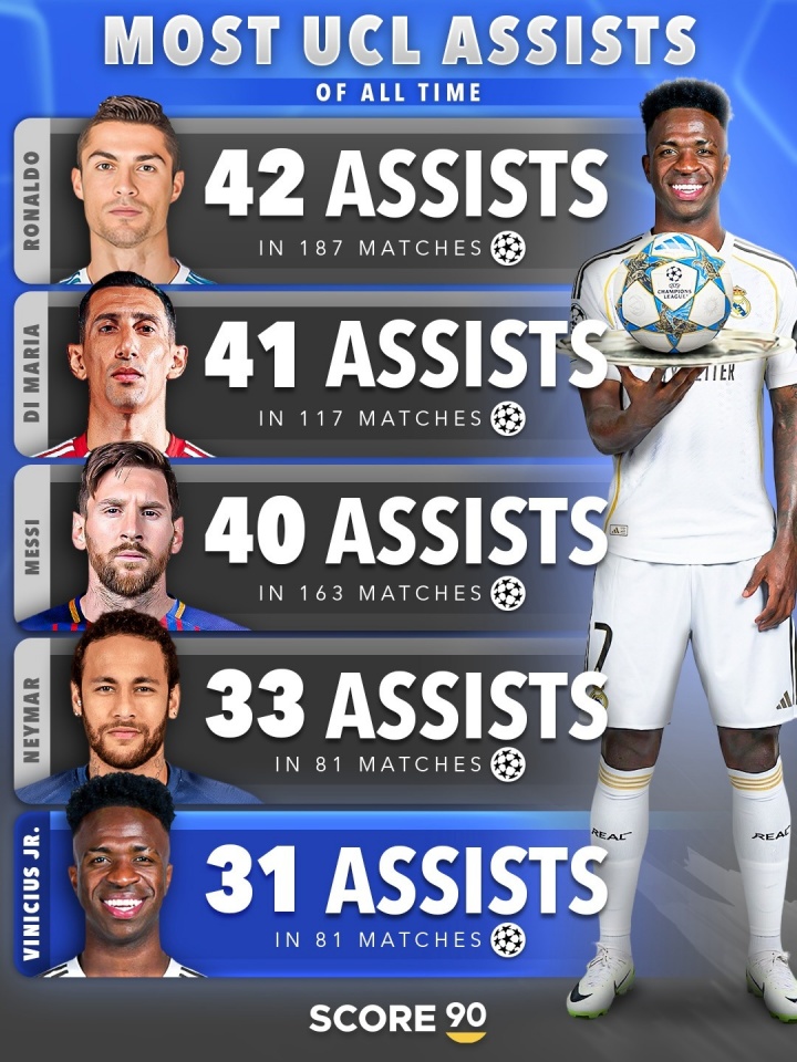 04月16日讯 欧冠1/4决赛次回合,皇马3-4总比分4-6不敌拜仁被淘汰,维尼修斯助攻姆巴佩破门,据统计这是维尼修斯在欧冠的第31次助攻,升至历史第5。