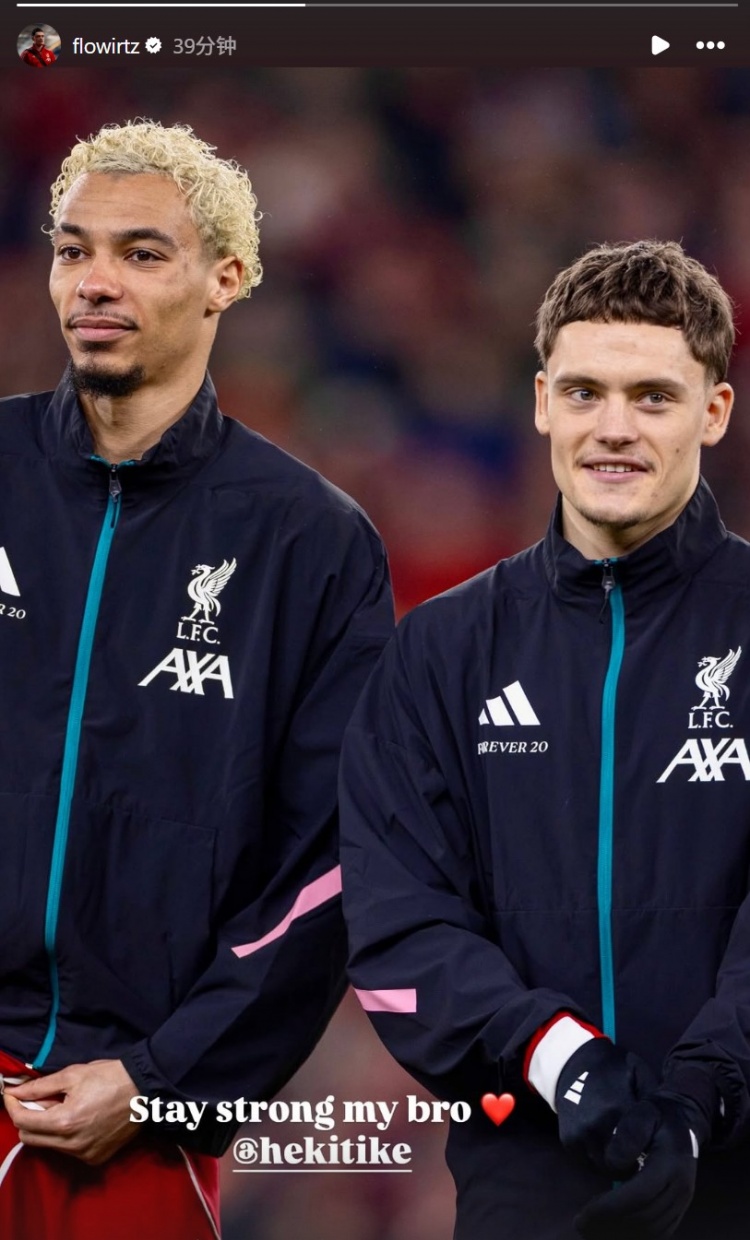 利物浦队友维尔茨也在个人社媒晒出与埃基蒂克的合照,配文鼓励道:“保持坚强我的兄弟!”