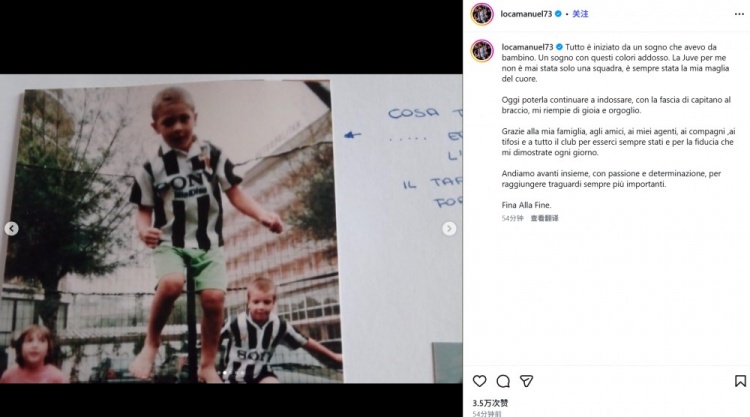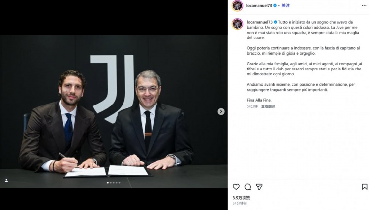 洛卡特利晒出自己的官宣续约照,并配文:“一切始于我儿时的一个梦想。一个与这些颜色相伴的梦想。对我来说,尤文从来不仅仅是一支球队,它始终是我心中最爱的球衣。”