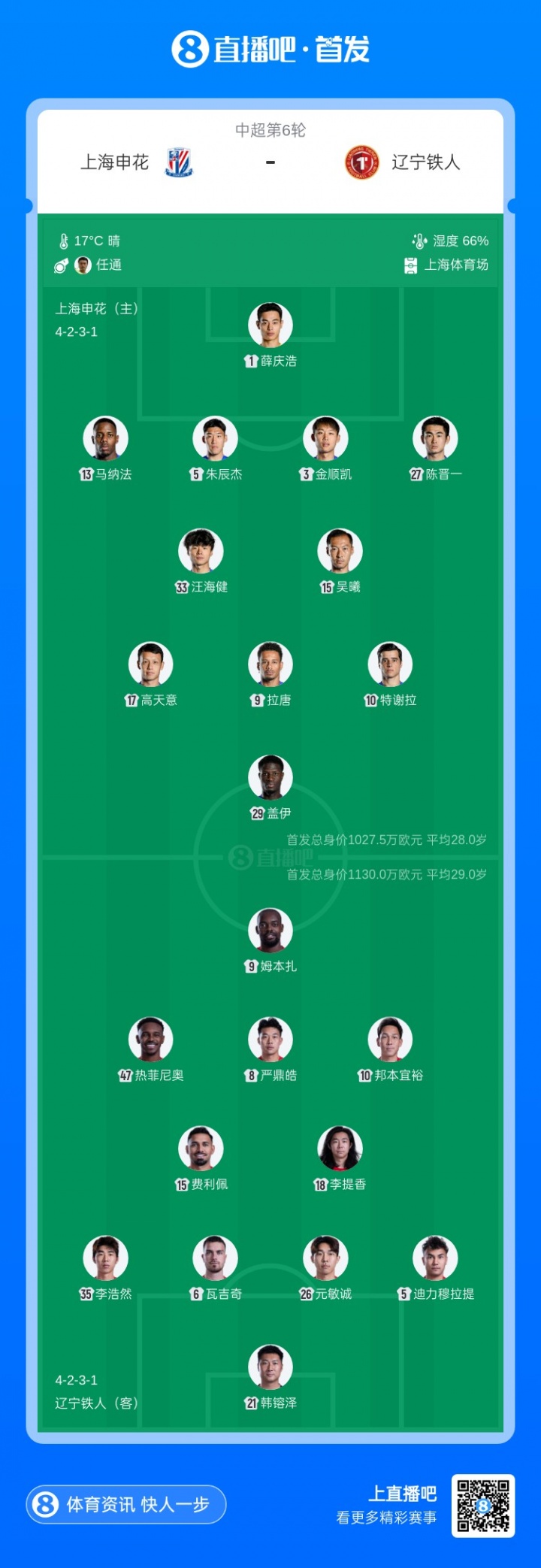 04月18日讯 北京时间20点,中超第6轮,上海申花vs辽宁铁人,赛前双方首发公布。【本场比赛申花方面4外援先发,米内罗和李可伤缺,铁人方面则是5外援齐出战,李提香、严鼎皓登场。】