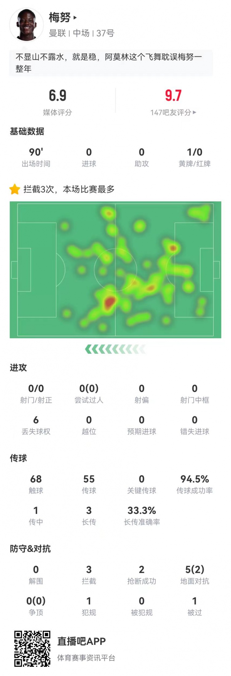 4月19日讯 曼联在本轮英超1-0击败切尔西,梅努本场数据如下: