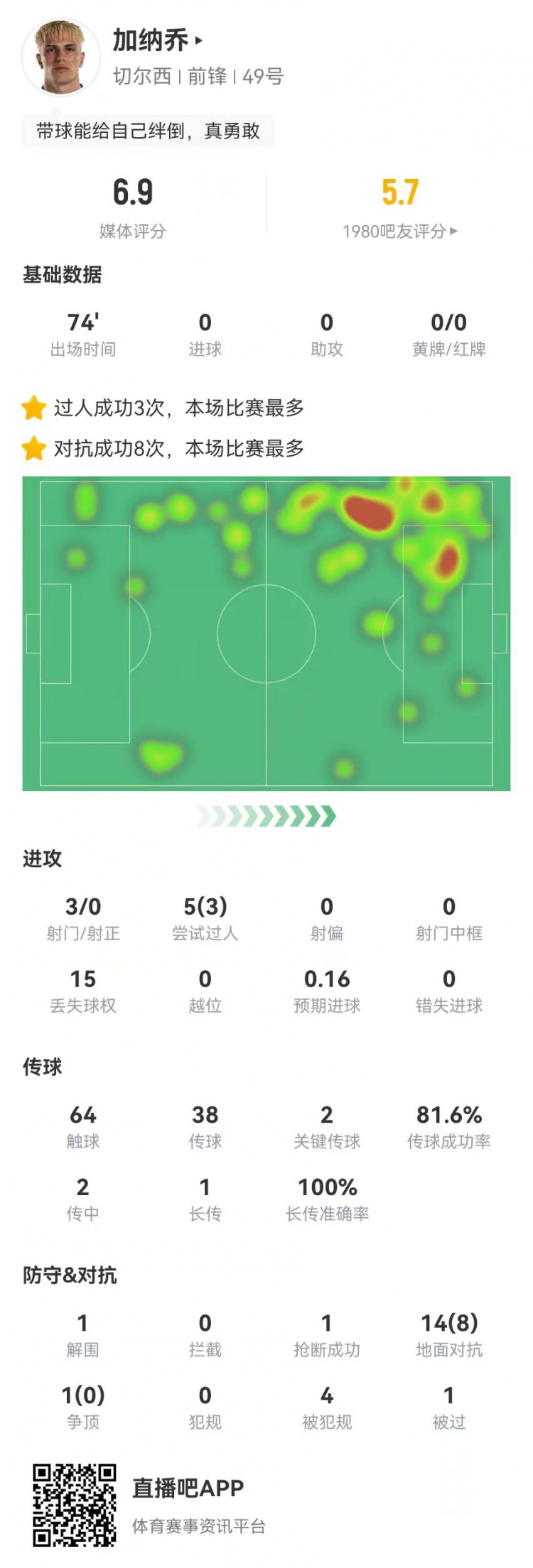 4月19日讯 切尔西在本轮英超0-1不敌曼联,加纳乔本场数据如下: